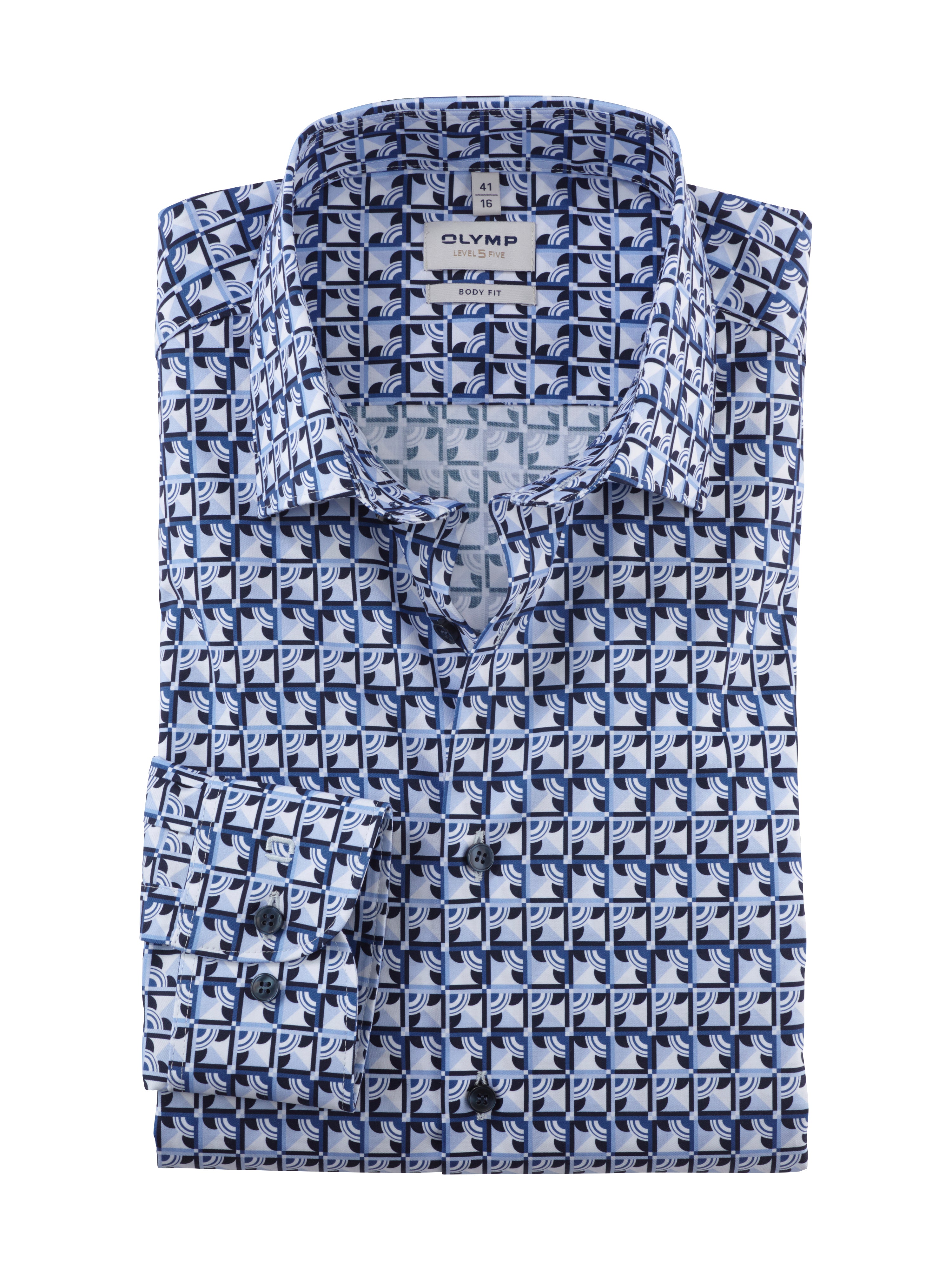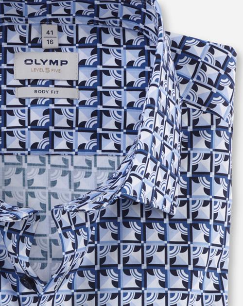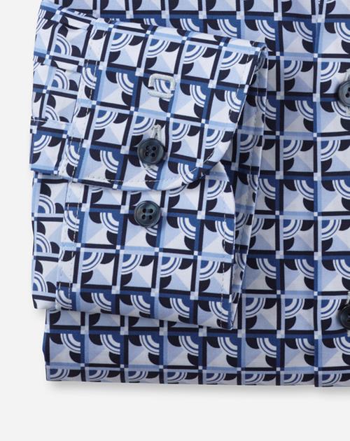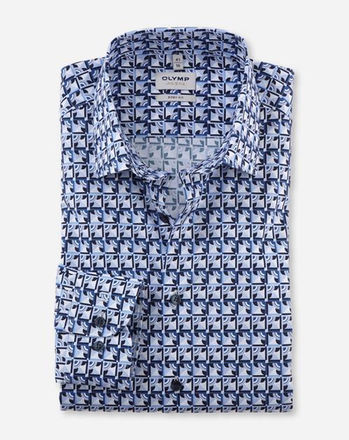 Kreativer Look gewünscht? Der besonders feine Twill-Comfort Stretch ist aus dem bewährten Baumwolle-Elastolefin-Mix gefertigt. Eine außergewöhnliche Musterkomposition mit Akzentuierung auf Bleu macht dieses OLYMP Level Five zum Eyecatcher. Dieses Businesshemd ist körperbetont geschnitten und mit einem jugendlichen New York Kent harmonisch abgestimmt. Bügelleichtes Handling.