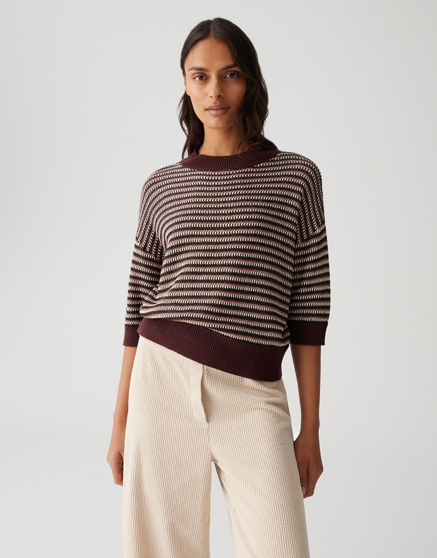 lockere Passform, Boxy Silhouette, leicht verkürzt geschnitten, 3/4 Arm, Rundhalsausschnitt, Rückenlänge ca. 51 cm bei Größe S, Model Größe 178 cm – trägt Größe S, Strick, Jacquard Struktur, weicher Griff, Strickbündchen
