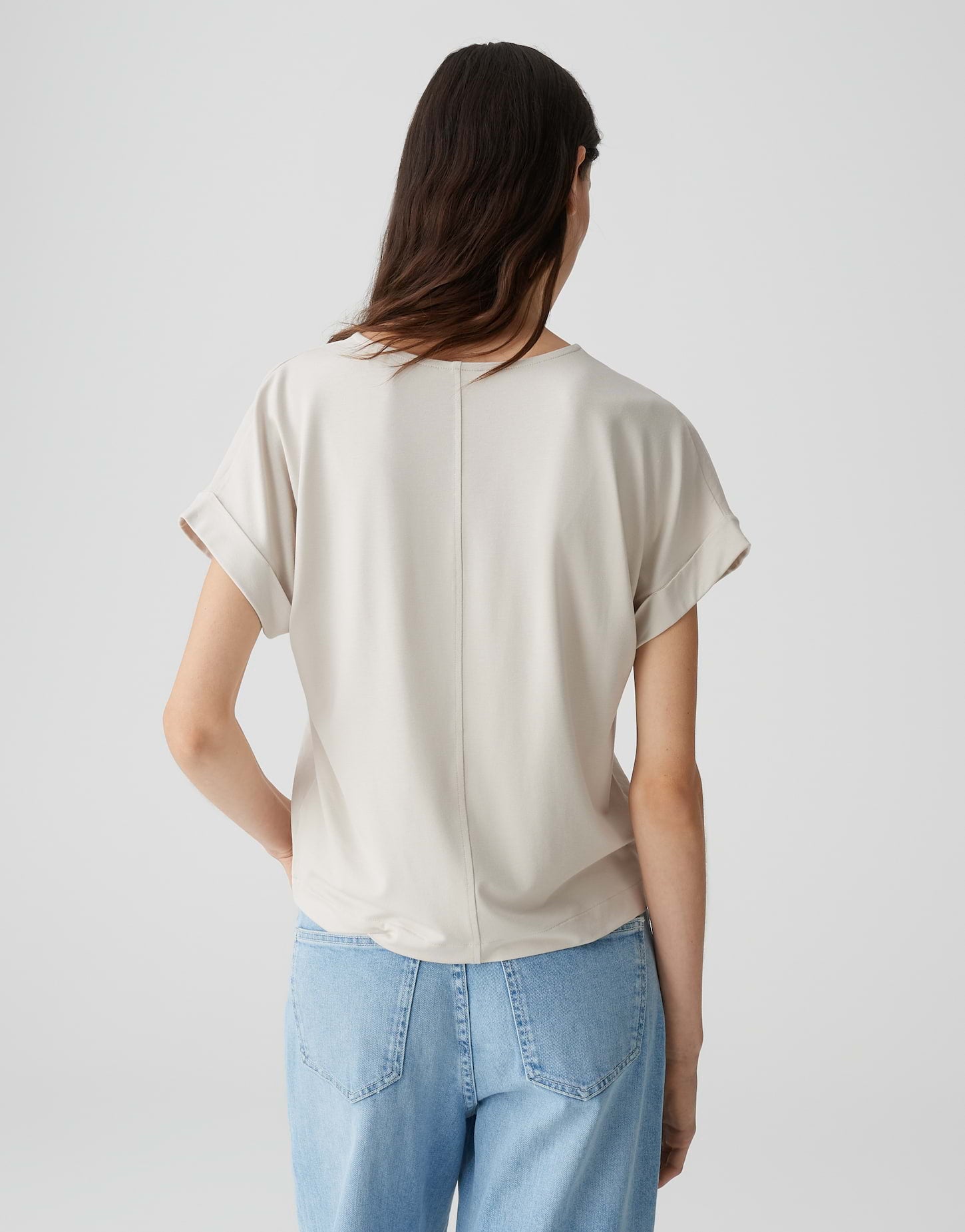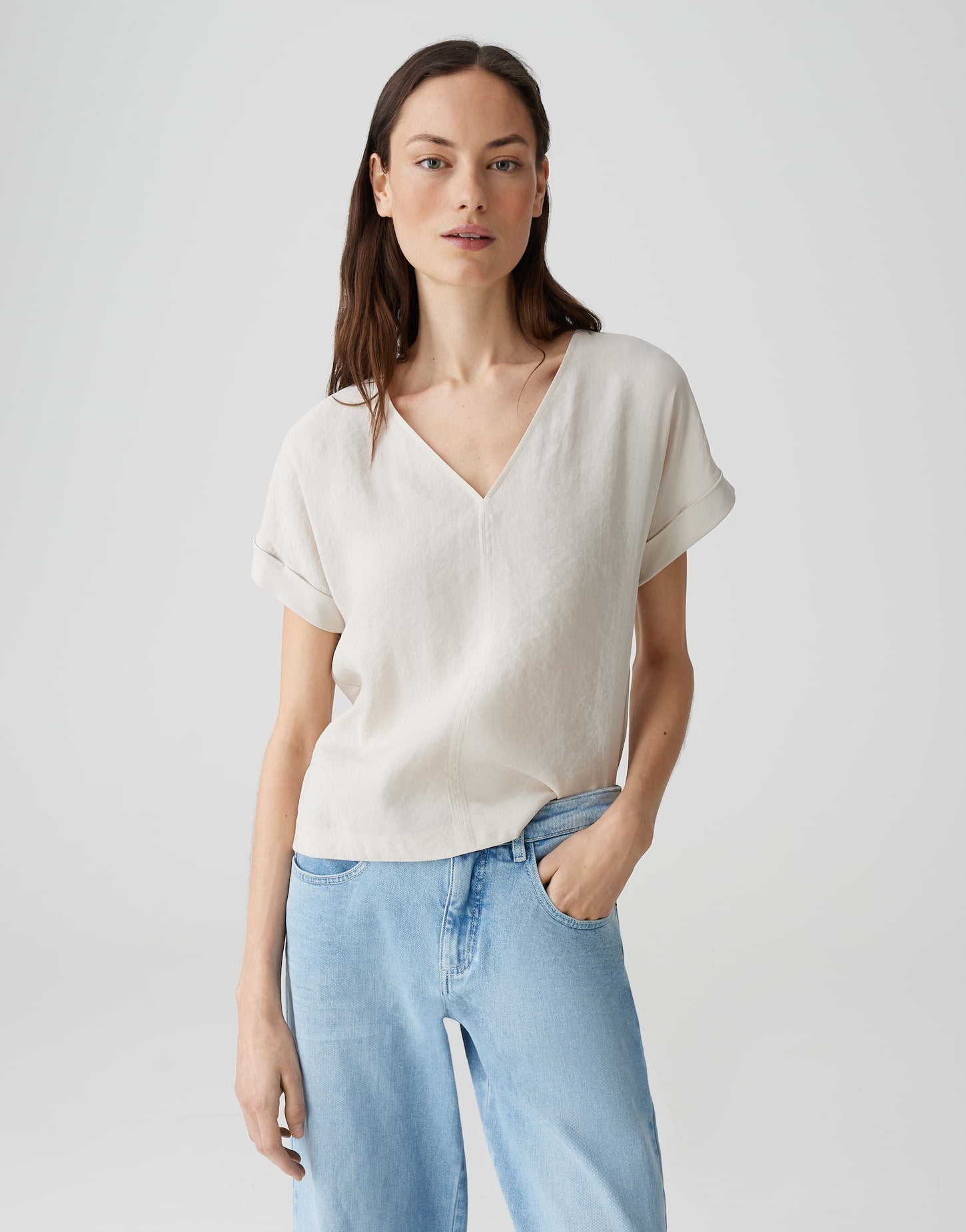 lockere Passform, gerader Schnitt, normale Länge, überschnittener Kurzarm, V-Ausschnitt, Rückenlänge ca. 55 cm bei Größe 36, Model Größe 178 cm – trägt Größe 36, Webware in der Front, Jersey im Rücken, dezente Struktur, extrem weicher Griff, fließender Fall, abgesteppte Teilungsnähte