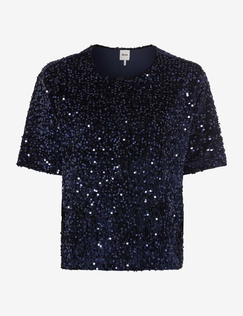 Glanzvolle Auftritte sind garantiert – mit dem Shirt im Style CARA S setzen Damen auf einen Look, der modernen Chic und festliche Eleganz mühelos vereint. Die körperumspielende Silhouette mit entspannter Schulter und leichter Taillierung schmeichelt der Figur und sorgt mit dem klassischem Rundhalsausschnitt für einen modernen Look. Funkelnde Pailletten verleihen dem samtigen Halbarm-Shirt einen festlichen Touch und machen es zum absoluten Hingucker bei jedem Anlass. Der hochwertige Samt aus einem Polyestermix fühlt sich nicht nur geschmeidig und luxuriös an, sondern sorgt dank seiner Elastizität zugleich für angenehme Bewegungsfreiheit und einen perfekten Sitz. Ein echtes Highlight. Farbe