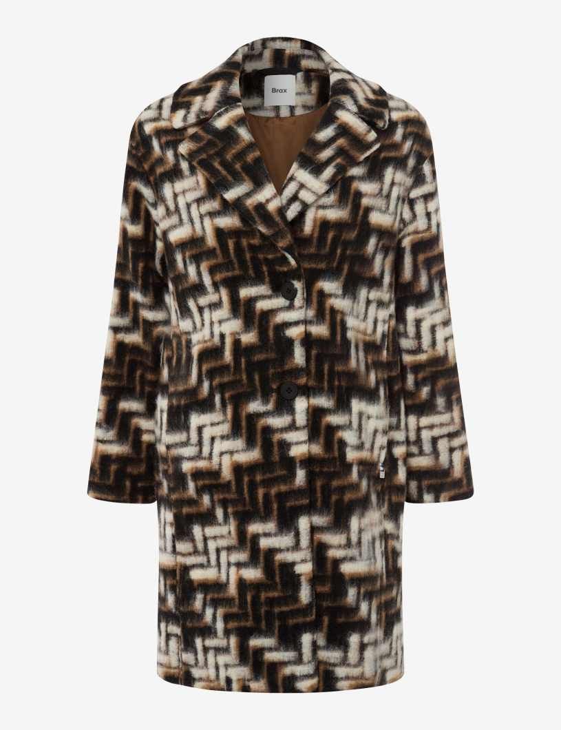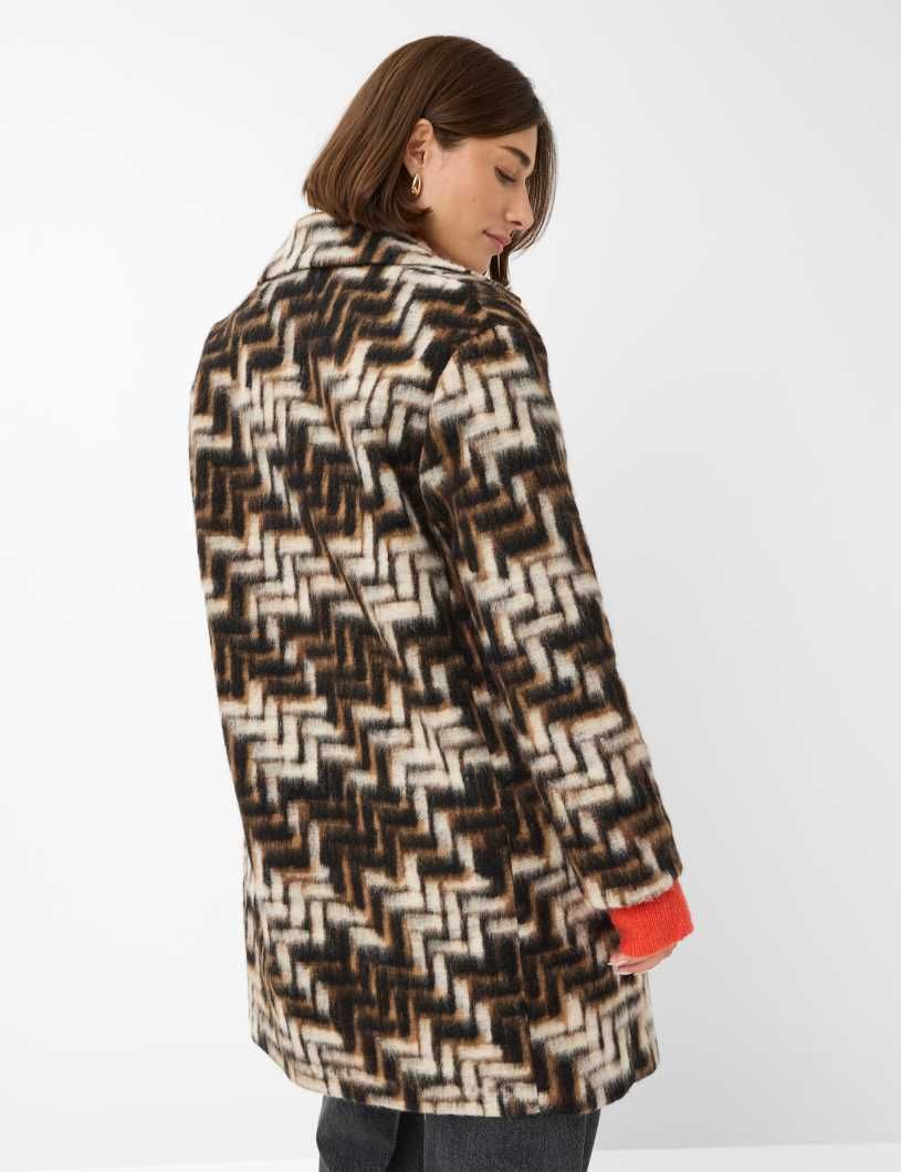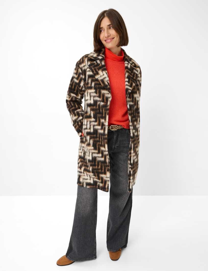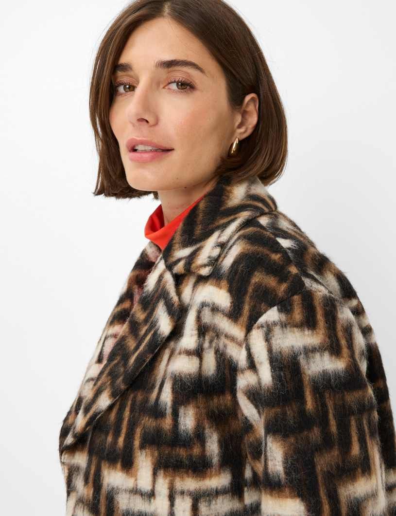 Der Mantel im STYLE DAVOS ist ein Statement-Piece für die kühle Saison – und das nicht nur wegen seines markanten Jacquardgewebes. Das traditionsreiche Hahnentritt-Muster wurde hier in eine moderne, beinahe grafische Komposition übersetzt, die Tiefe, Bewegung und einen unverwechselbaren Charakter ins Spiel bringt. Die aufwendige Webstruktur sorgt für einen lebendigen Look, der sich von klassischen Mustern abhebt und gleichzeitig eine gewisse Zeitlosigkeit bewahrt. Der legere, gerade Schnitt mit elegantem Reverskragen umspielt die Figur, während die verdeckte Knopfleiste für eine cleane Front sorgt. Seitlich integrierte Nahttaschen fügen sich harmonisch ins Design ein und bieten praktischen Stauraum. Das Material macht diesen Mantel nicht nur optisch, sondern auch haptisch zu einem Highlight: Die hochwertige Mischung aus Schurwolle, Polyester und Polyacryl sorgt für angenehme Wärme, ein weiches Griffgefühl und hohe Formstabilität. Gleichzeitig verleiht die Materialkomposition dem Jacquardgewebe eine edle Struktur und Strapazierfähigkeit – Eigenschaften, die diesen Mantel zu einem verlässlichen Begleiter für viele Saisons machen.